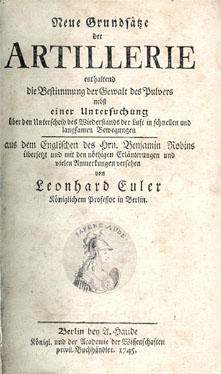 Das bahnbrechende Werk des Engländers B.Robins, der nach Lösungen ballistischer und pyrotechnischer Probleme forschte. „Robins probably is best known as the inventor of the ballistic pendulum. (...). Robins best known work, New Principles of Gunnery, appeared in 1742(...). It was there that Robins described the ballistic pendulum.“ (DSB 11,493f.). „Robins set down for the first time a logical mathematical basis for computations upon which modern gunnery has been founded.“ (Riling, Guns and Shooting 223). Euler, der seit 1727 an der Akademie in Petersburg gelehrt hatte, 1741 einem Ruf an die neugegründete Akademie in Berlin gefolgt war und 1744 zum Direktor der mathematischen Klasse ernannt wurde, hat das Grundwerk wesentlich erweitert und kommentiert und „dieses Werk wohl Friedrich II. (...) als Nützlichkeitsnachweis für die Mathematik dargebracht.“ (Killy, DBE III,193). Das Werk regte u.a. J.H.Lambert zu eigenen Berechnungen an; der preußische General G.F.von Tempelhoff benutzte es „in seinem Bombardier prussien (Berlin 1781) zur Lösung des ballistischen Problems. ... Um die Anfangsgeschwindigkeit der Kanonenkugeln etc. zu prüfen, dient der ballistische Pendel. Der von Robins erfundene besteht in einer Maschine, bei der ein starker Holzblock pendelartig aufgehangen ist, gegen den eine Kugel abgeschossen wird, worauf man aus dem Schwingungswinkel des Pendels die Geschwindigkeit der abgeschossenen Kugel berechnet.“ (Meyer 1857,II,851).