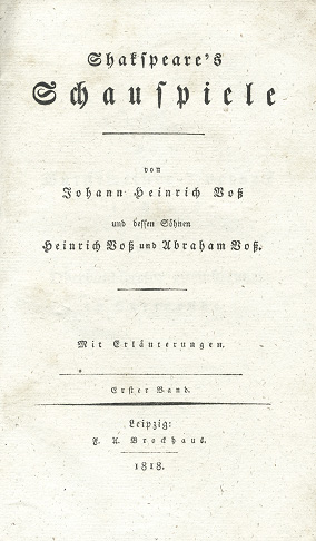 Die wohl seltenste aller wichtigen Übersetzungen der Schauspiele ins Deutsche. Obwohl aus philologischer Sicht die korrektere, kam sie zur Unzeit, die SCHLEGELsche „Aneignung“ hatte sich bereits durchgesetzt. COTTA, bei dem 1810/5 einige Dramen in VOSSischen Übersetzungen erschienen waren, lehnte wegen des geschäftlichen Mißerfolgs eine Gesamtausgabe ab. „An seiner Stelle griff BROCKHAUS zu, der sich vom VOSSischen Übersetzerruhm viel versprach ... Aber auch BROCKHAUS sah sich schnell enttäuscht – als VOß sich weigerte, einer Halbierung der Auflage von 2000 auf 1000 zuzustimmen, führte der Verleger nach dem dritten Band die Ausgabe nicht weiter.“ (R.Wittmann. Ein Verlag, S.453). Trotz BROCKHAUS’ dringender Warnung übernahm der Metzlersche Verlag die Fortsetzung. Für ihn war es ein Prestige-Projekt. Die Auflage wurde auf 800 reduziert, auch diese noch zu hoch kalkuliert. „Das Unternehmen hatte sich als völliger kommerzieller Mißerfolg herausgestellt ...“ (S.456), dennoch und trotz des Todes des Vaters VOß (1826) und des Sohnes HEINRICH (1822) wurde die Ausgabe bis zu ihrem Abschluß weitergeführt. „Erst 1829 erscheint, vom einzigen Überlebenden der drei, ABRAHAM V. betreut, der neunte und letzte Band des mühevollen Unternehmens. Enttäuschend blieb die Reaktion der Kritik, geschweige denn der Käufer.“ (ebda). Die Prophezeiung HEINRICHs in einem Brief an BROCKHAUS, „erst in sechszig Jahren würde man ihre Übersetzung verstehen“, erfüllte sich nicht ganz. Erst in jüngerer Zeit erkennt man die Vorzüge dieser korrekten, aber spröden Übersetzung und stellt sie gleichberechtigt neben die SCHLEGEL/TIECKsche.
