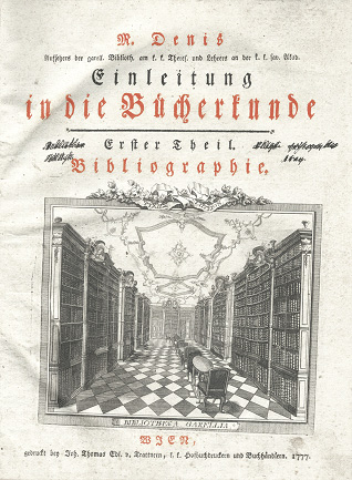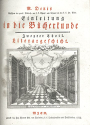 „Zu den angesehensten Persönlichkeiten des geistigen Wien in den letzten Jahrzehnten des 18.Jhrdts zählt Michael Denis.“ (Rabenlechner I,S.7). Der (Ex-) Jesuit M.DENIS (Schärding 1729 – 1800 Wien) trug entschieden zur Verbreitung norddeutscher Aufklärungsliteratur in Österreich bei und errang mit seinen eigenen literarischen Werken höchsten Respekt auch im protes-tantischen Norddeutschland. Fr.NICOLAI war ihm zeitlebens freundschaftlich verbunden. DENIS’ Übertragung der Gedichte OSSIANs war die wohl am stärksten beachtete im deutschen Sprachraum, seine unter dem Pseudonym SINED veröffentlichte Bardenlyrik ein beinahe ebenso großer Erfolg. Seit 1759 an der vornehmsten Schule Österreichs, der Theresianischen Akademie als Lehrer und Aufseher der Garellischen Bibliothek, eine Ansicht ziert die Titel des vorliegenden Werks, veröffentlichte er mehrere buchwissenschaftliche Arbeiten, die sämtlich große Anerkennung bei den Zeitgenossen fanden. So rezensierte JOHANN HEINRICH MERCK bei Erscheinen des ersten Bandes: „Der Barde Sined erscheint hier in dem Licht eines der bescheidensten und ämsigsten Gelehrten, der den ausgebreitetsten Kenntnissen eine nicht gemeine Beurtheilungskraft in Auswahl der Materien an den Tag legt. Es ist dies ohnstreitig ein Werk, das unserm Vaterland und seinem Jahrhundert Ehre macht, und als ein klaßisches Buch auf die Nachkommenschaft fortgehen wird.“ (Der Teutsche Merkur 1778, S.152).