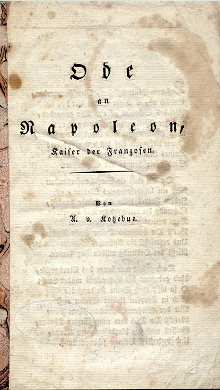 Außerordentlich seltener Druck von Kotzebues antinapoleonischer Ode, in der er den Kaiser – „entmenschter Tiger“– anklagt, sich von dem Retter Frankreichs aus dem Chaos zu einem Henker und Barbaren gewandelt zu haben, der Europa mit „roten Ströhmen“ vergossenen Bluts überzieht. Die Flugschrift, die in allen mir bekannten Literatursammlungen fehlt (selbst in der Sammlung G.Weissteins, der immerhin über 100 Werke Kotzebues zusammentrug), ist in deutschen Bibliotheken dreimal nachzuweisen, dort mit den angenommenen Erscheinungsdaten 1813 bzw.1814. Dies halte ich für zu spät angesetzt, da der Text ohne jeden Hinweis auf den Rückzug des napoleonischen Heeres im Oktober 1812 ist und ohne den Spott, der sein 1812 erschienenes "Der Flußgott Niemen und Noch Jemand. Ein Freudenspiel ..." kennzeichnet.