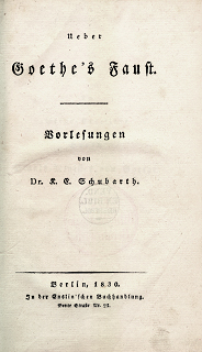 K.E.Schubarth (Brinitze/Schlesien 1796 – 1861 Hirschberg) hatte 1818 mit seiner ersten Veröffentlichung "Zur Beurtheilung Goethe’s" dessen Aufmerksamkeit und andauernde Anteilnahme gewonnen. Ein Besuch Schubarths bei Goethe im September 1820 vertiefte die Beziehung, „von nun an suchte Goethe seinen jungen Freund auf jede Weise Weise zu fördern“ (Goedeke). Zu der erhofften Anstellung als Bibliothekar in Berlin kam es wegen Schubarths Gegnerschaft zu F.A.Wolfs Homerkritik nicht, er nahm schließlich 1830 die durch Goethes Fürsprache angebotene Stellung am Gymnasium in Hirschberg an. Hier lehrte er mit einer kurzen Unterbrechung bis zu seinem Tod. HERRMANN HETTNER, einer seiner bedeutendsten Schüler, „rühmt sein vorzügliches Wirken.“ (Goedeke). Die vorliegende Schrift ist von besonderem Interesse, weil in sie Goethes eigene Äußerungen aus den Gesprächen während des Besuches 1820 eingeflossen sind, die sich vor allem um Faust und dessen Fortsetzung drehten (vgl. Tag- und Jahreshefte 1820). Mit gedruckter Widmung an „Herrn Staats-Minister von Goethe“, datiert „Hirschberg 16.März 1830“.