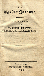 Die Päbstin Johanne. Romantisch behandelt von Fr. Antonius von Padua, Bibliothekar des Kapuzinerklosters zu St.Vincenz. Mit einem Titelkupfer (Reinhart del., Liebe sc.).