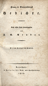 F.v.Sonnenberg (Münster 1779 - 1805 Jena) studierte nur widerwillig Rechtswissenschaften in Jena, dennoch schloß er das Studium bereits als 19jähriger erfolgreich ab. Seine Leidenschaft galt der Dichtkunst, bereits als 15jähriger verfaßte er eine Ode in Klopstocks Manier "Das Weltende". Begeistert für die Einheit Deutschlands zeigen ihn 1802 und 1804 die Oden "Frankreich und Teutschland" und "Teutschlands Wiedergeburt". Bereits durch die Ablehnung eines Heiratsantrags aus der Bahn geworfen stürzte ihn ihn die Nachricht von der Niederlage der österreichischen Truppen bei Ulm 1805 in Verzweiflung und schließlich Freitod. Er sprang aus dem Fenster seiner Wohnung. Goedeke urteilt hart: "... von den Vorstellungen, die er sich dichterisch schuf, überwältigt; durchaus verworren und wahnsinnig schon ehe er dafür galt." Mit erläuternden Anmerkungen sowie einem Gedicht "Den Manen Sonnenbergs" versehen wurde die vorliegende, seltene Sammlung von seinem Jenaer Studienfreund J.G.Gruber herausgegeben.
